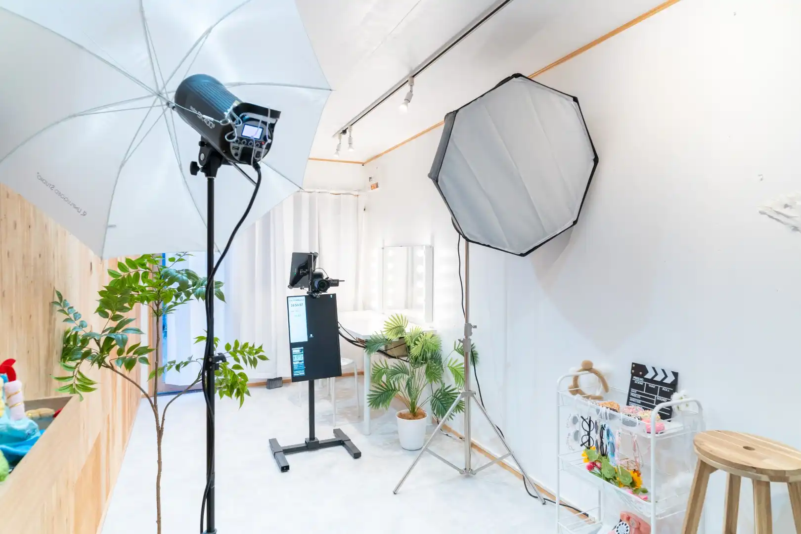 リモコン操作で「今いい表情!」の瞬間にすぐ撮れます。スタジオの造花・小物は使い放題。
